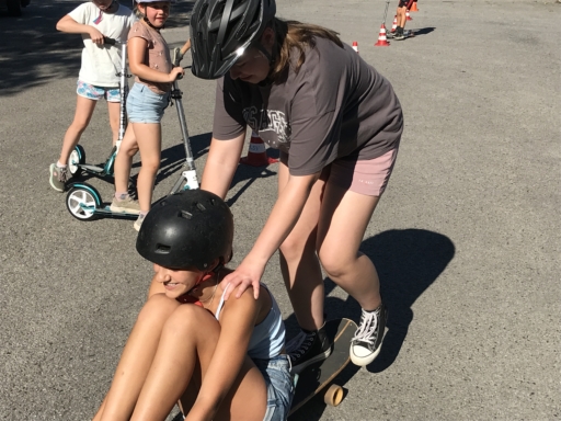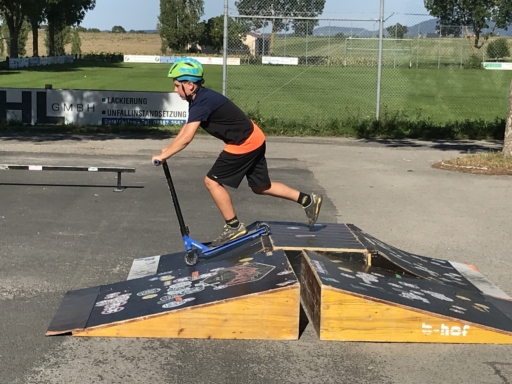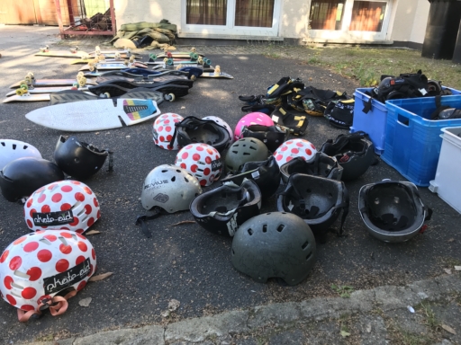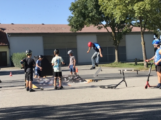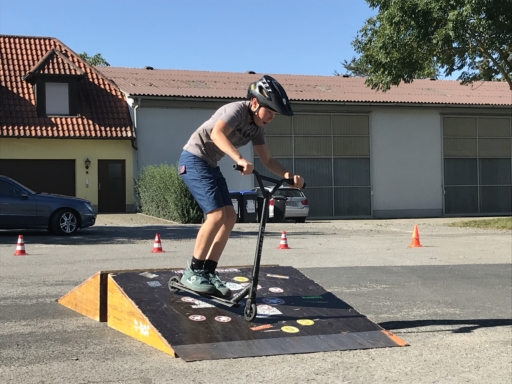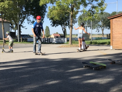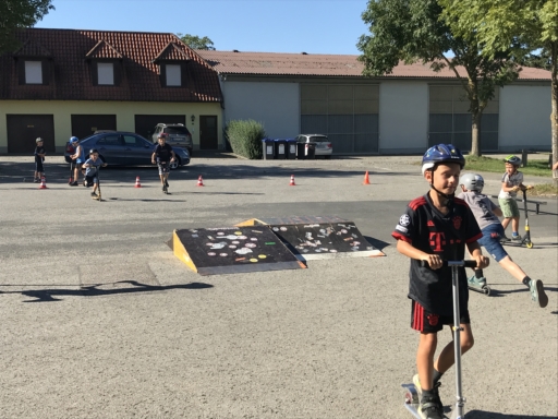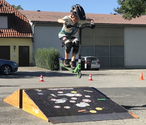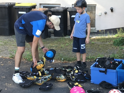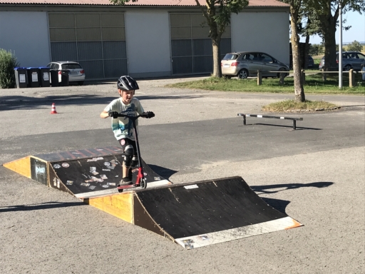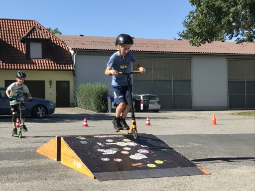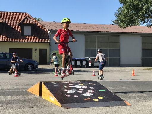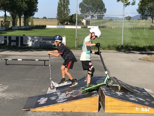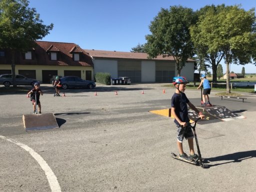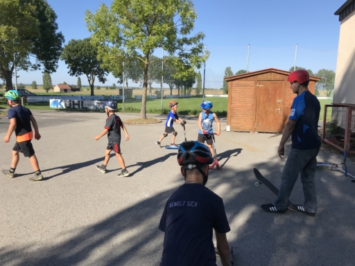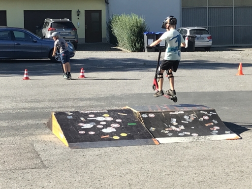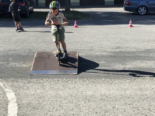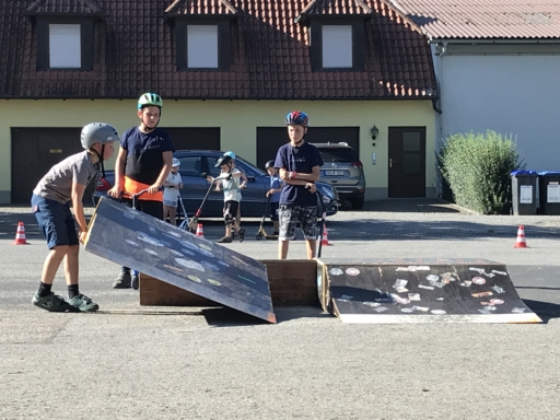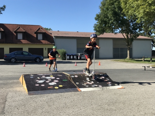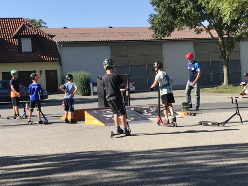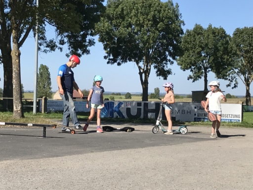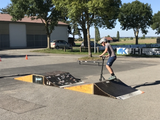 Der Skatebus brachte neben Schutzausrüstung eine große Anzahl unterschiedlicherSkategeräte und tragbarer Rampen mit, so dass auf dem Parkplatz vor dem Sportheim im Nu ein kleiner Skatepark entstand. Standen manche Kids zu Beginn noch etwas wackelig auf den Boards, so wurden sie von den beiden betreuenden Skatern Lukas und Johannes fachmännisch angeleitet, um schon nach kurzer Zeit sicher durch den Parkour zu skaten. Schnell stellte sich eine Routine ein und es wurden mit den mobilen Rampen verschiedene Hindernisse und Sprungmöglichkeiten zusammengebaut, die die jungen Skater immer wieder aufs Neue beim Überqueren herausforderten.