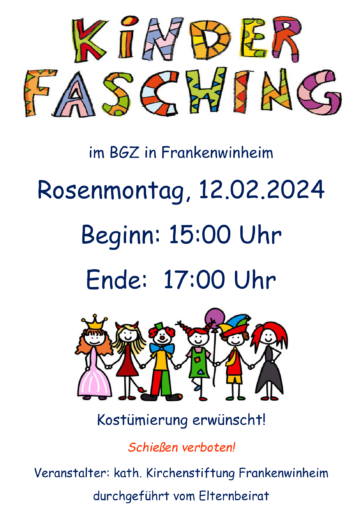 Herzliche Einladung zum Kinderfasching Von Yannik Bauer|2024-02-12T19:52:16+01:0012. Januar 2024|Einladungen und Termine, Kindergarten, Kinderkirche| Die kath. Kirchenstiftung und der Elternbeirat laden alle Kinder auch in diesem Jahr herzlich zum Kinderfasching am Rosenmontag, den 12.02.2024 von 15 bis 17 Uhr im BGZ in Frankenwinheim ein. Über den Autor: Yannik Bauer Gebürtiger Frankenwinheimer, derzeit "hauptberuflich" Student und seit 2021 mit Elmar Walter für die Betreuung der Homepage verantwortlich.