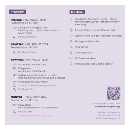 Weitere Informationen zum Ablauf und der Kontakt zur Tischreservierung können dem Schoppentage-Flyer und der Homepage des Sportvereins entnommen werden.
