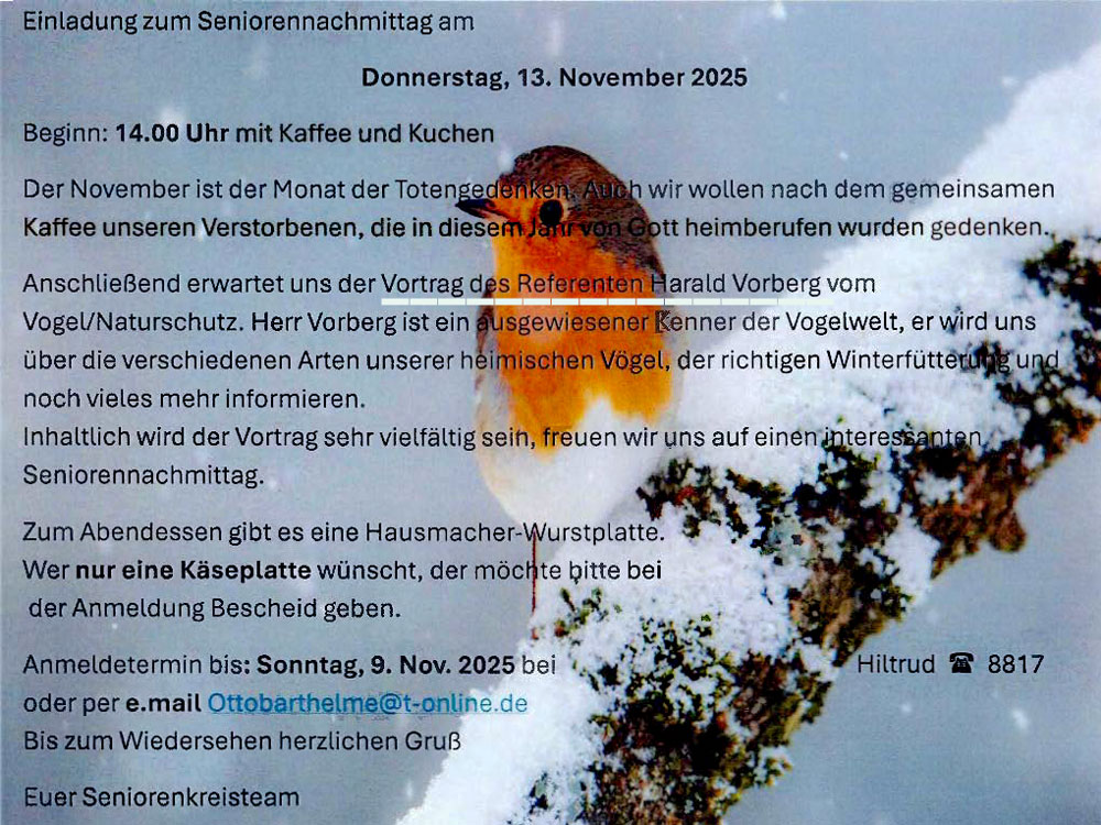 Der Seniorenkreis Frankenwinheim/Brünnstadt lädt herzlich ein zu seinem Novembertreff am 13.11.2025! Totengedenken, Vortrag, Kaffee und Kuchen sowie Abendessen sind eingeplant!