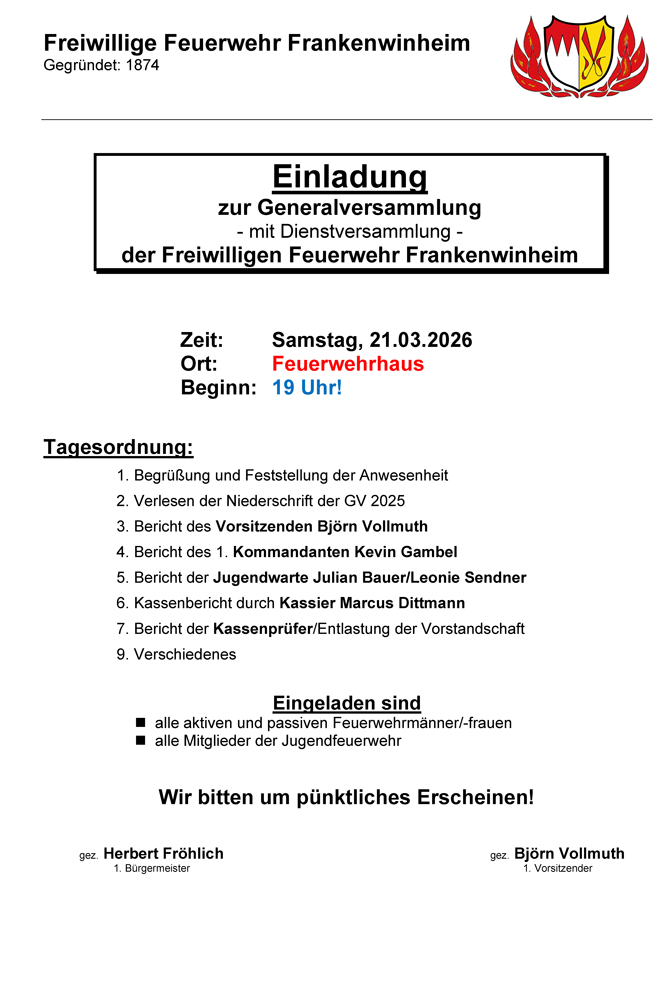 laden alle aktiven und passiven Feuerwehrfrauen/Feuerwehrmänner und alle Mitglieder der Feuerwehrjugend