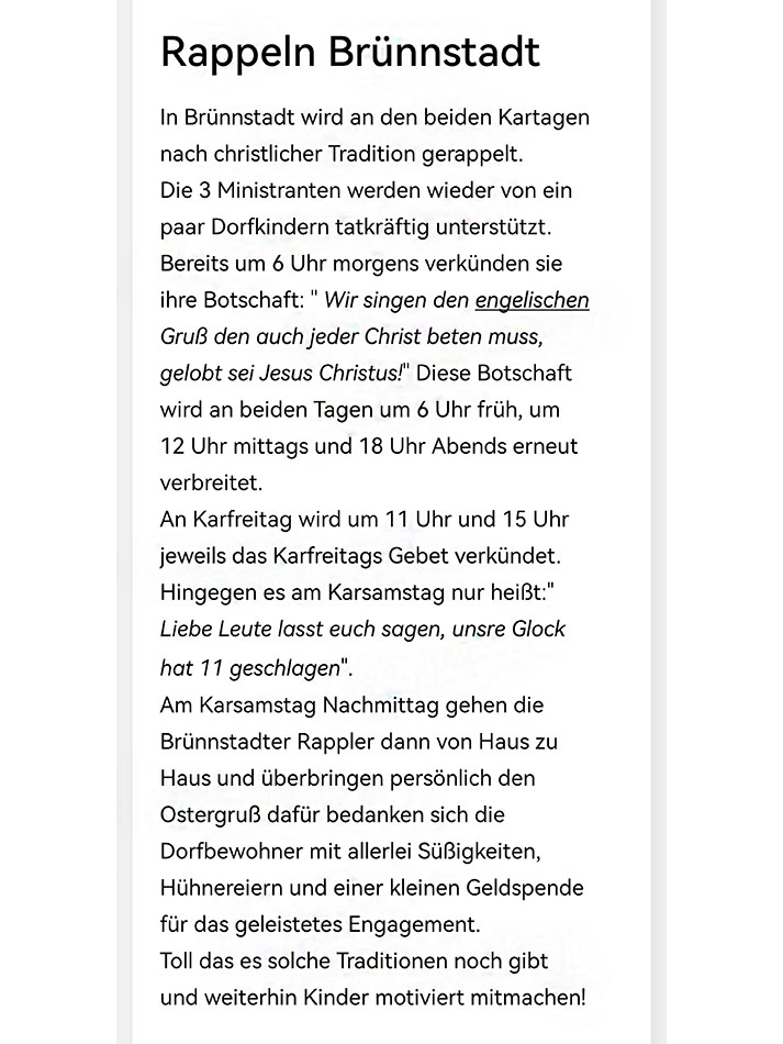 Rappeln in Brünnstadt 2026 Von Elmar Walter|03. April 2026|Allgemein, Brünnstadt, Kirche| Rappeln in Brünnstadt in den Kartagen 2026 – Bilder und Text von Runa Dittmann! Über den Autor: Elmar Walter Hallo! Mein Name ist Elmar Walter! Ich bin seit 2021 mit Yannik Bauer für die Betreuung der Homepage zuständig. Ein schöner Freizeitspaß! :-)