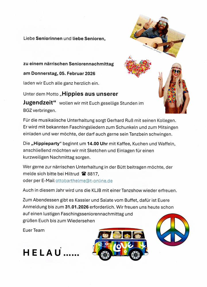 Der Seniorenkreis lädt herzlich ein zu einem närrischen Seniorennachmittag am Donnerstag, 5. Februar 2026! Motto: Hippies aus unserer Jugendzeit! Weitere Infos siehe Einladung!