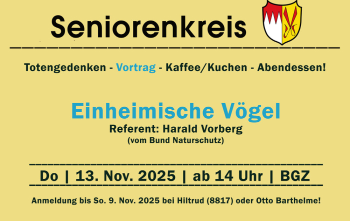 Elmar Walter2025-11-03T13:43:10+01:00Novembertreff beim SeniorenkreisVon Elmar Walter|2025-11-03T13:43:10+01:0003. November 2025|Allgemein, Einladungen und Termine, Frankenwinheim, Senioren|