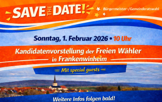Am Sonntag, 1. Februar 2026, stellen sich die Kandidatinnen und Kandidaten der Freien-Wähler-Gruppe Frankenwinheim um 10 Uhr im Sportheim vor. Dazu sind alle Bürgerinnen und Bürger aus Frankenwinheim eingeladen, denn ...
