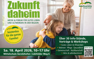 Mit der regionalen Messe „Zukunft Daheim“ am Sa, 18. April 2026, lädt die ILE-Region WeinPanorama Steigerwald Menschen jeden Alters ein, sich umfassend über gutes Leben und Altwerden in der Region ...