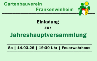 Die Vorstandschaft des Vereins für Gartenbau und Landespflege e. V. Frankenwinheim lädt alle Mitglieder am Samstag, 14. März 2026 um 19:30 Uhr im Feuerwehrhaus zur diesjährigen ...