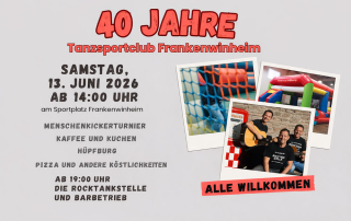 Der TSC Frankenwinheim feiert am 13. Juni 2026 sein 40-jähriges Bestehen - ein Grund zur Freude und zum gemeinsamen Feiern! Der Tag gestaltet sich wie folgt: ...