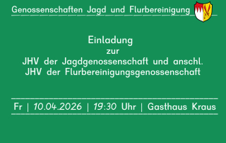 Herzliche Einladung zu den Jahreshauptversammlungen am Freitag, 10.04.2026, um 19:30 Uhr in der Gastwirtschaft Kraus! Jagdgenossenschaft Frankenwinheim (nicht öffentlich!) * siehe Tagesordnung gez. Richard Sendner (1. ...