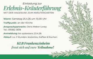Die KLB Frankenwinheim lädt herzlich ein zu einer Kräuterführung für die ganze Familie am Samstag, 25.04.26, von 15 - 17 Uhr Anmeldung und Info bei Doris Weber-Lorey bis 23.04.25 ...