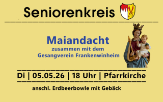 Herzliche Einladung zur Maiandacht der Senioren zusammen mit dem Gesangverein Frankenwinheim am Dienstag, 5. Mai 2026 um 18 Uhr in der Pfarrkirche anschließend: Erdbeerbowle mit Gebäck ...